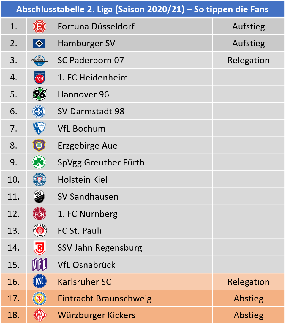 Wir haben die Fans der 2. Liga gefragt, wie die Abschlusstabelle der Saison 20/21 aussehen wird, und so haben sie getippt...