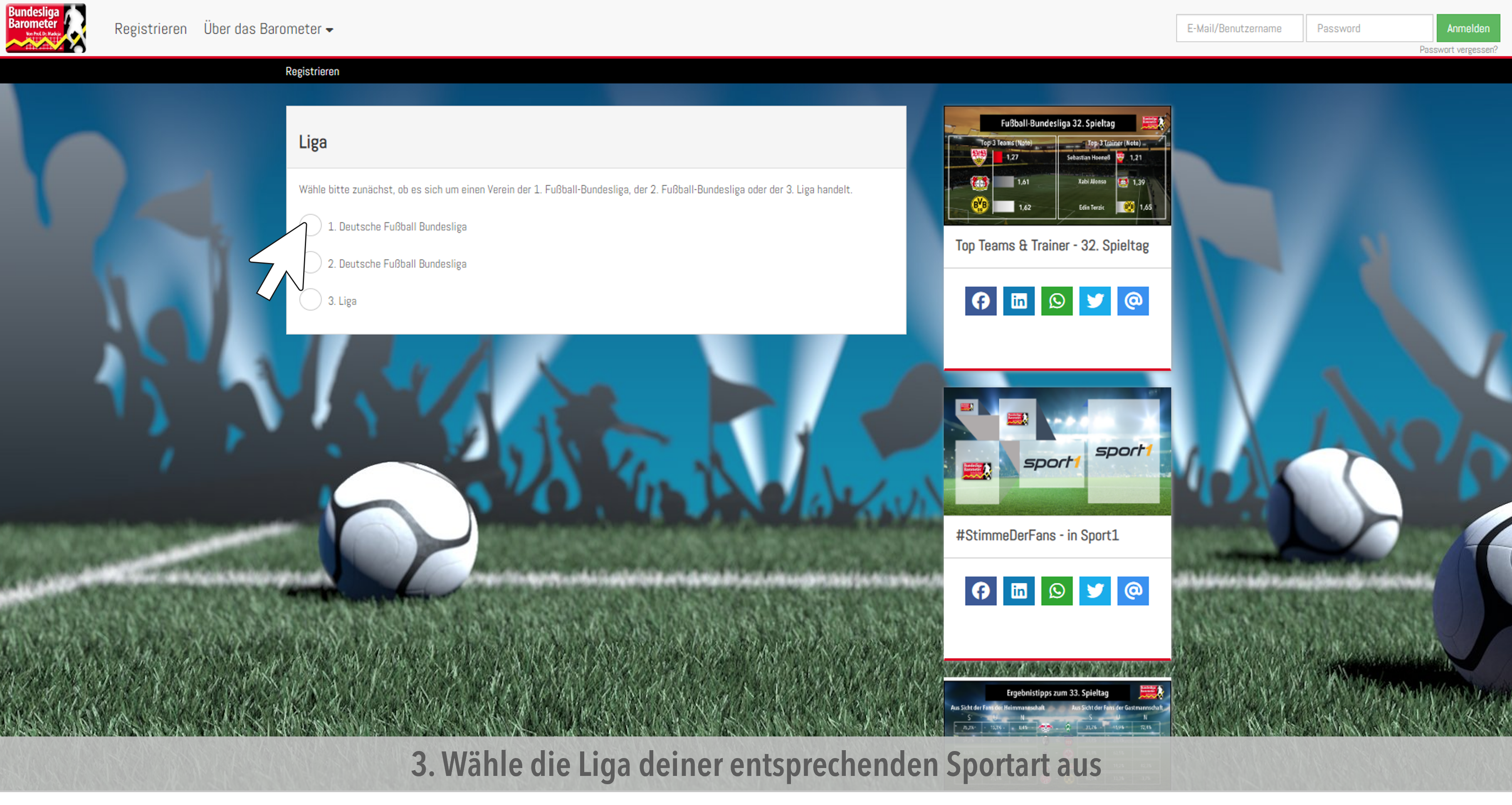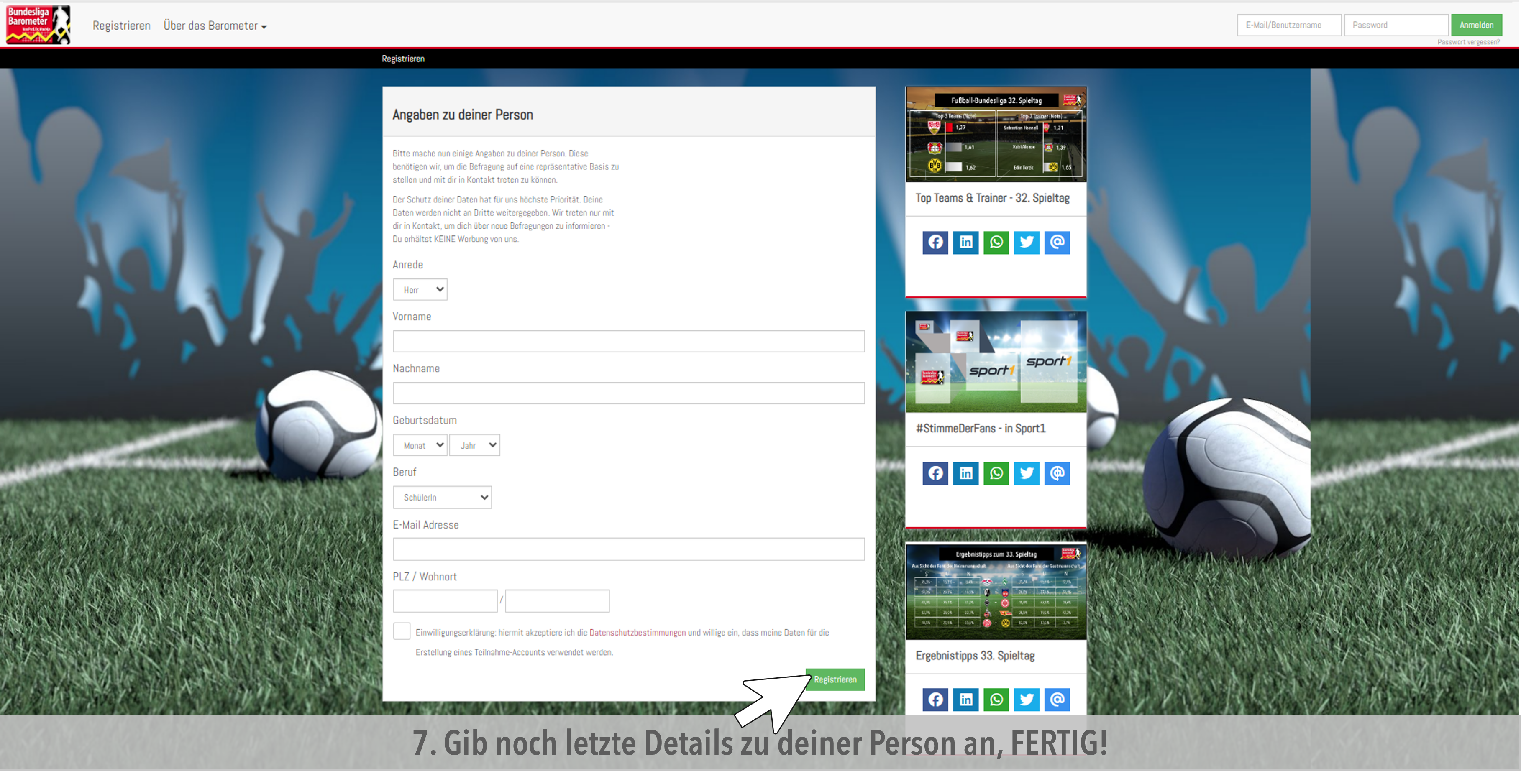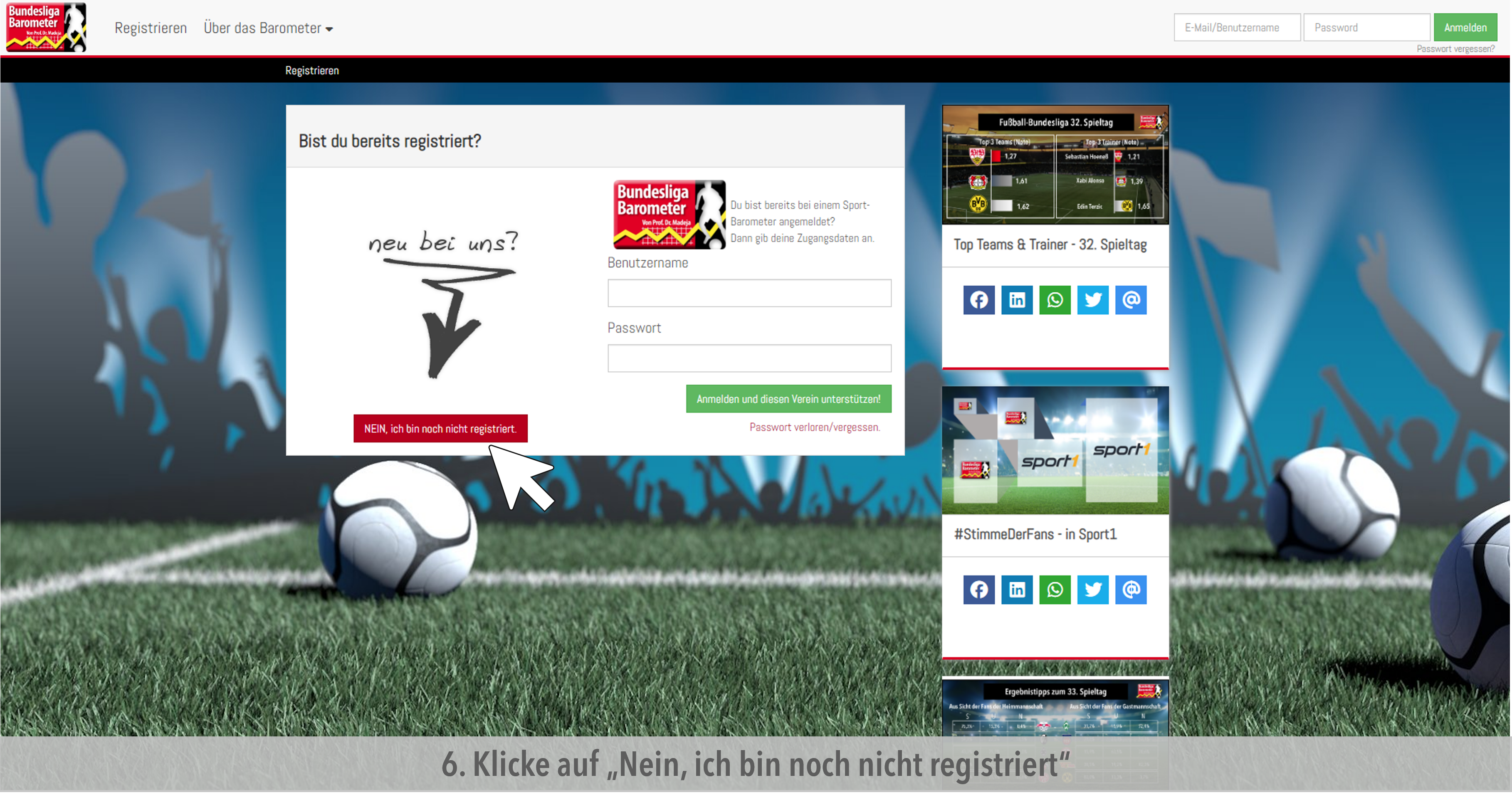 - Nachdem du auf den Link in der Email geklickt hast oder in deinem Browser www.bundesligabarometer.de eingegeben hast, loggst du dich hier ein, um in dein Profil und zur Befragung zu gelangen.