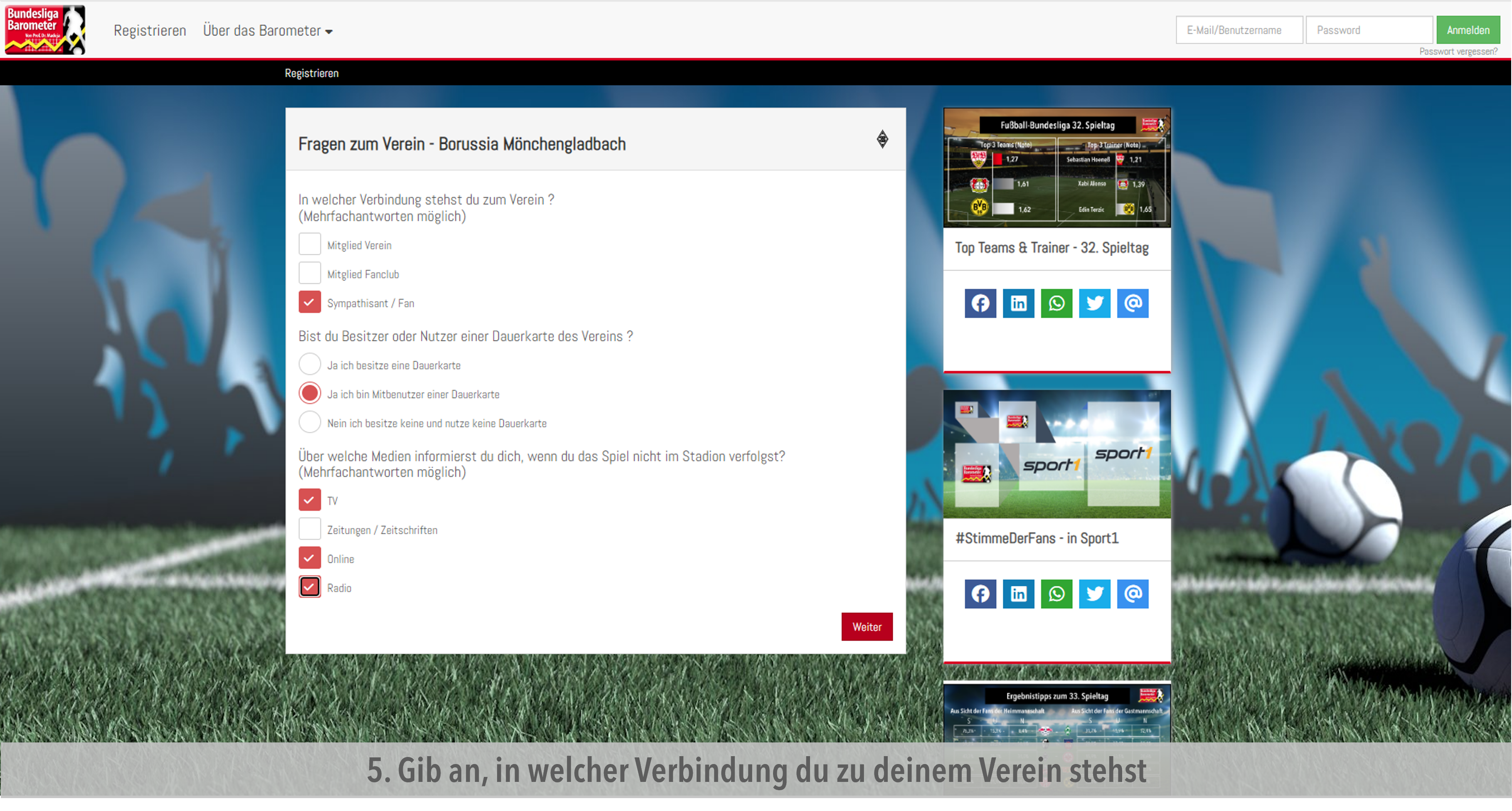 - Nun kannst du ein paar Details zu deiner Verbindung zu deinem Verein angeben - wie du dich über ihn informierst und wie eng du mit ihm verbunden bist.